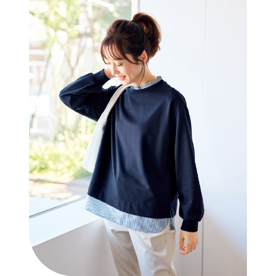カットソー身頃の衿と裾にストライプ生地をドッキング。バランスに悩むレイヤードも、これなら1枚で決まります。