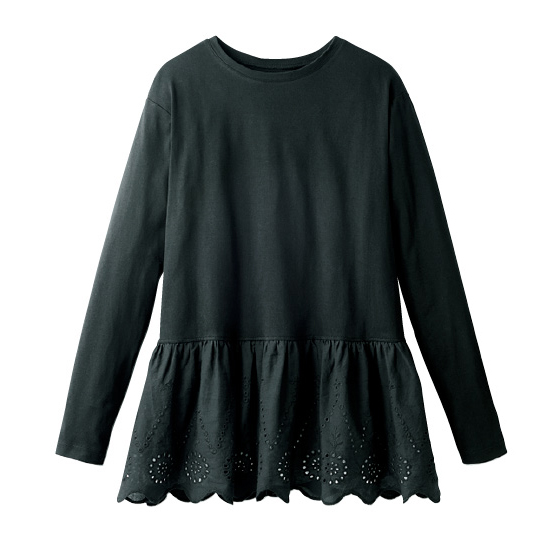 本体部分はカットソー素材、裾はスカラップ刺繍で華やぎをプラス。旬の短丈トップスを重ねれば好バランスに。