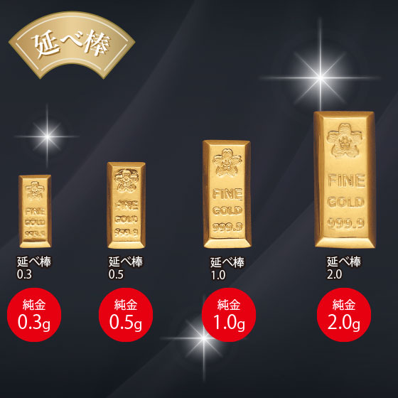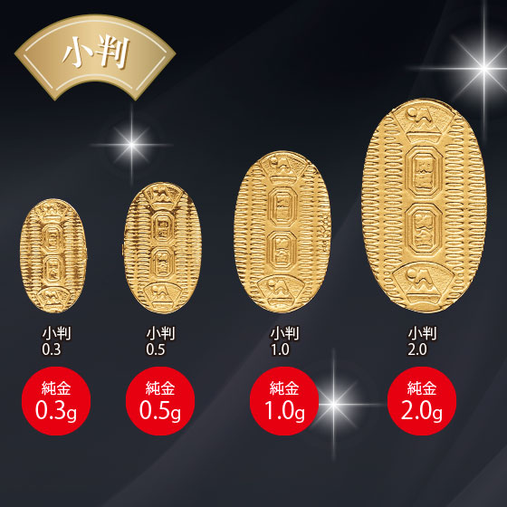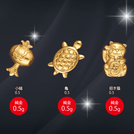 ●サイズ:延べ棒=0.3/約7×3mm、0.5/約8×3.5mm、1.0/約10×4.5mm、2.0/約13×6mm、小判=0.3/約8×4.5mm、0.5/約9.5×5.5mm、1.0/約11.5×6.5mm、2.0/約16×9mm、小槌=約6×4mm、亀=約8×4.5mm、招き猫=約5×3.5mm