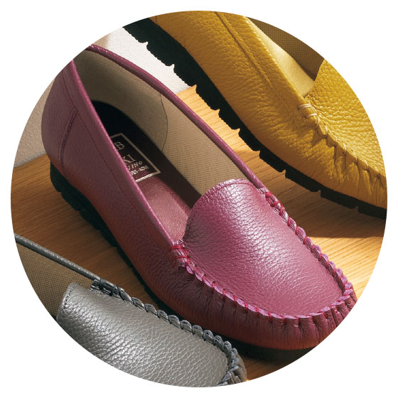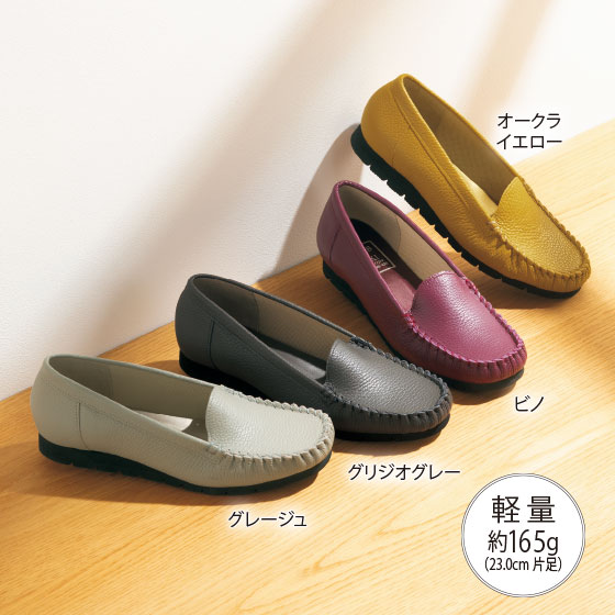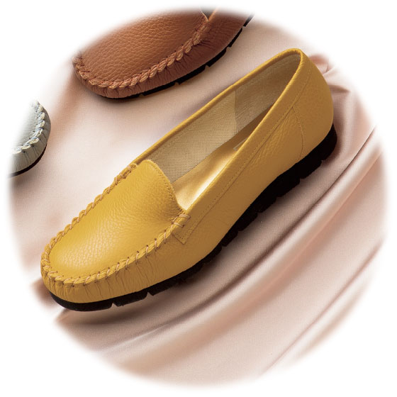 やわらかな革が心地よくなじむ、色で魅せる手編みモカシン。