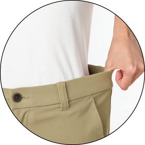 ウエストに伸縮性のあるインベルトを採用。おなか回りがゆったりラクで食後の窮屈感も軽減。