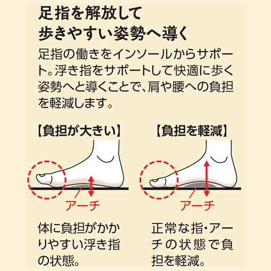 トップアスリートを足元から支えてきた長年の実績と技術に基づき、浮き指をサポートしながら、生活の中でうまく「足を使える」ように導くインソールです。通勤や立ち仕事などにもおすすめです。