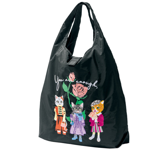 愛嬌のある猫たちを刺繍でデザイン。しっかりマチがあり、2Lペットボトル5本が入る大きめサイズです。肩掛けがラクな幅広の持ち手。