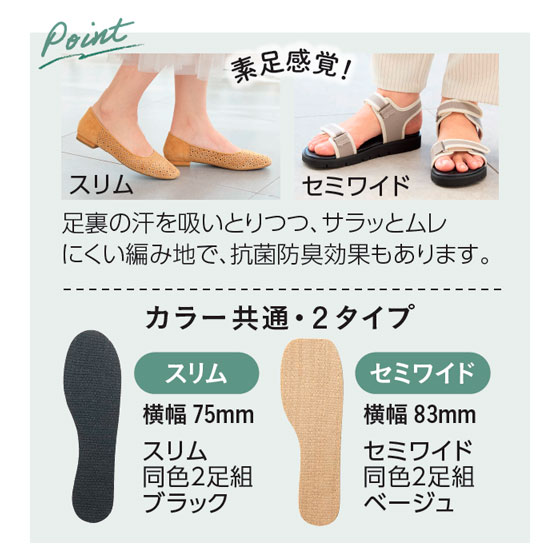 足裏の汗を吸いとりつつ、サラッとムレにくい編み地で、抗菌防臭効果もあります。表面は靴下にも使われる素材。裏面はグリップ性があり、すべりにくい。