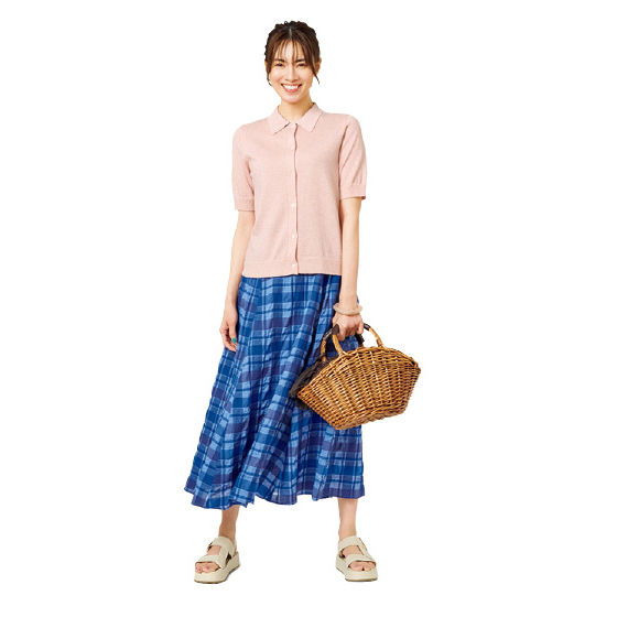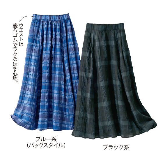 自然なシワ感と部分的にシアーを入れた、表情豊かな夏素材。ボリューミーなシルエットとチェック柄で魅せる主役級スカートです。※夏秋に着用できます。