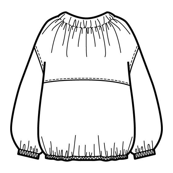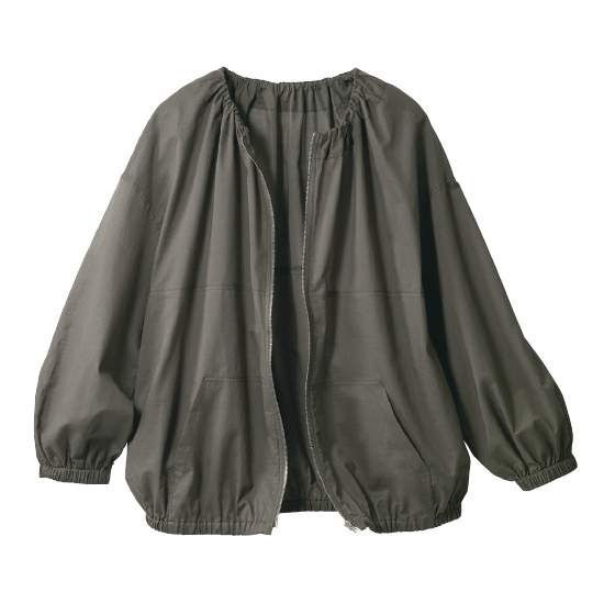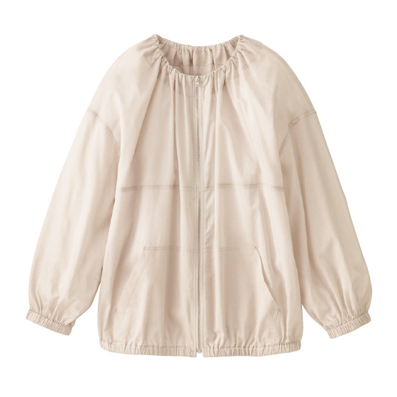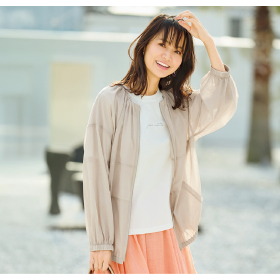 シアー素材の抜け感を活かしつつ、ふんわりシルエットでフェミニンに仕上げました。軽くて持ち運びもしやすく、お出かけに1枚あると安心です。袖口はゴム入りだから腕まくりもOK。