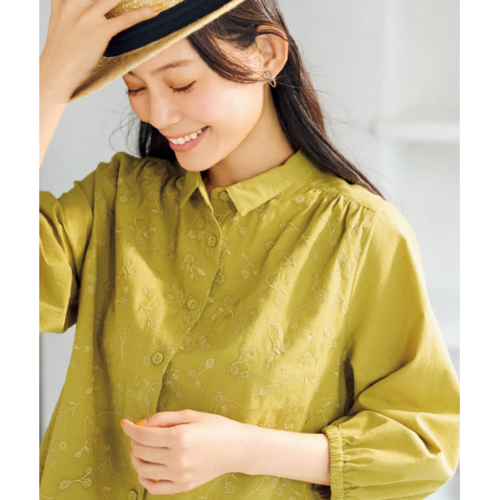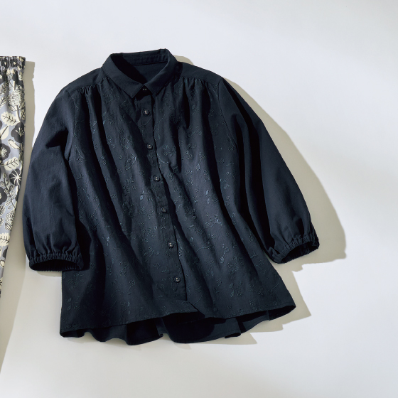 前身頃にあしらった刺繍は身生地と同色だからほどよいナチュラル感。7分袖で秋口まで長く着られます。