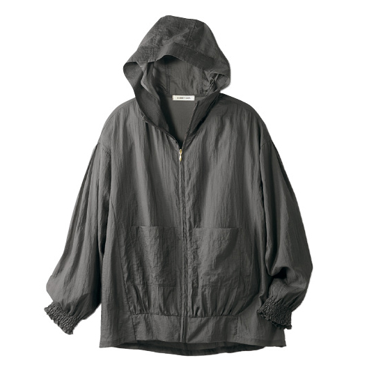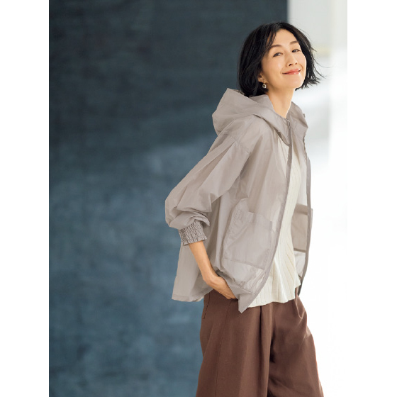 旬のシアー素材にUVカット機能をプラス。1枚で体形カバーも日差し対策もこなす、夏のお助けブルゾン。袖アップしやすい袖口ゴム仕様。
