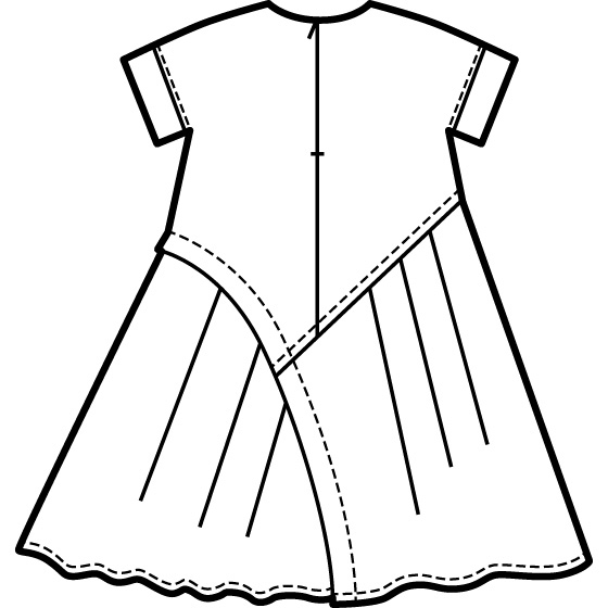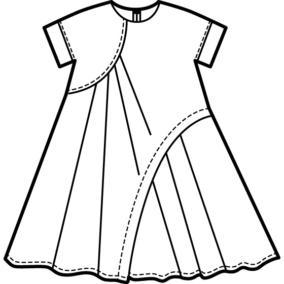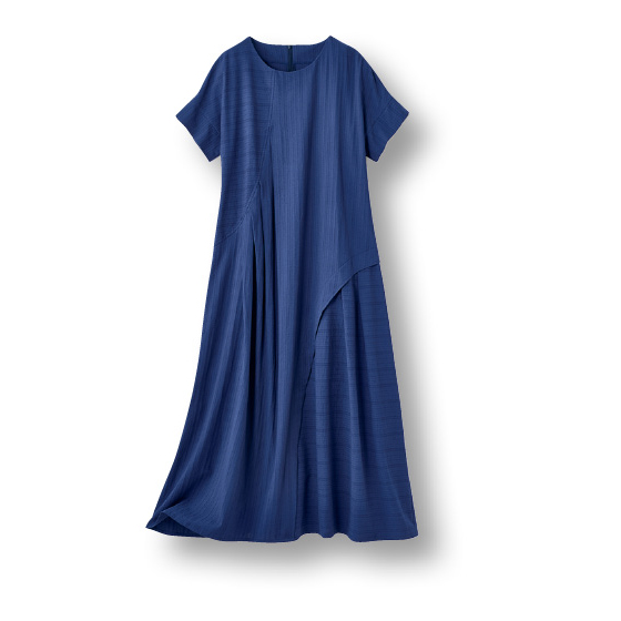 曲線の切替や、不揃い幅のタック使い。遊び心が夏らしいジャカード生地のワンピース。体形を拾いにくいゆったりシルエット。