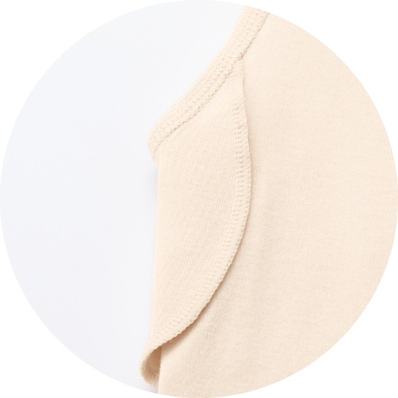 身生地は、より細番手の糸で編み立てた、しなやかで薄く涼しい素材。肌にやさしい綿100%で、汗を気持ちよく吸収します。アウターの汗ジミ対策として活躍する、汗取りパッド付きです。