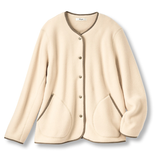 ふんわり軽いフリース生地。ゆるシルエットでニットの上にも重ねやすく、パイピングとステッチ使いでさりげなく洒落見え。