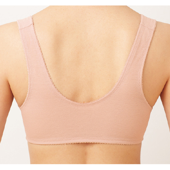 幅広ストラップで肩の負担を軽減。肩ひもからサイドにかけては、シャリ感がさわやかな綿混素材。バストのおさまりがよく、美しいシルエットに整えます。