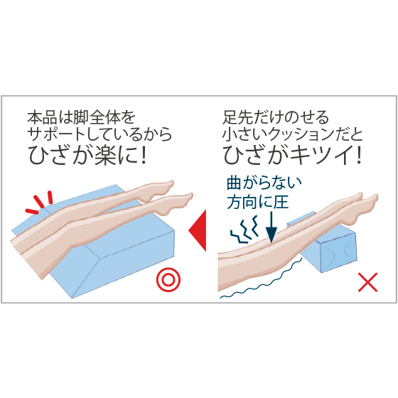 脚の屈曲に合わせた形状の、大きめサイズのクッション。脚の重さを分散させながら支えるから、ひざはもちろん腰までラク。寝ながらゆったり”休足“を。