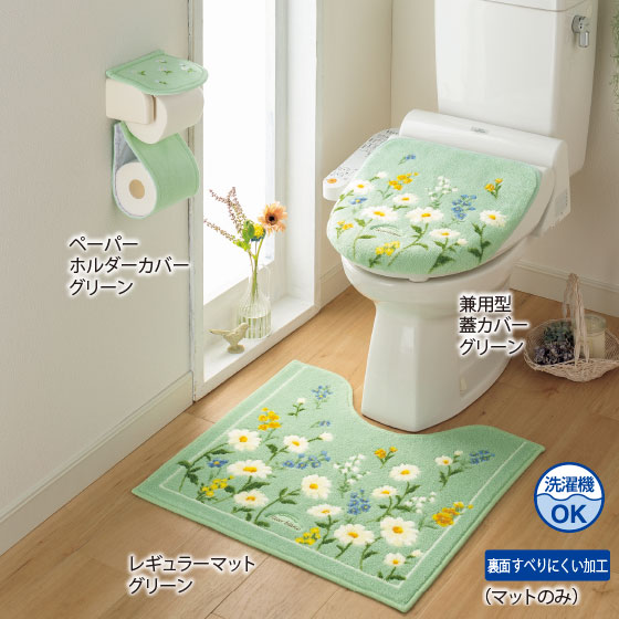 ●素材:<蓋カバー・マット>アクリル100%(抗菌防臭加工)、蓋カバー裏面=吸着シート(アクリル樹脂)、マット裏面=EVA樹脂(すべりにくい加工)、<ペーパーホルダーカバー>綿75%・ポリエステル25%(成型部品=ポリプロピレン)