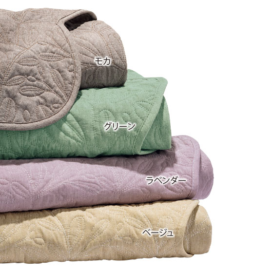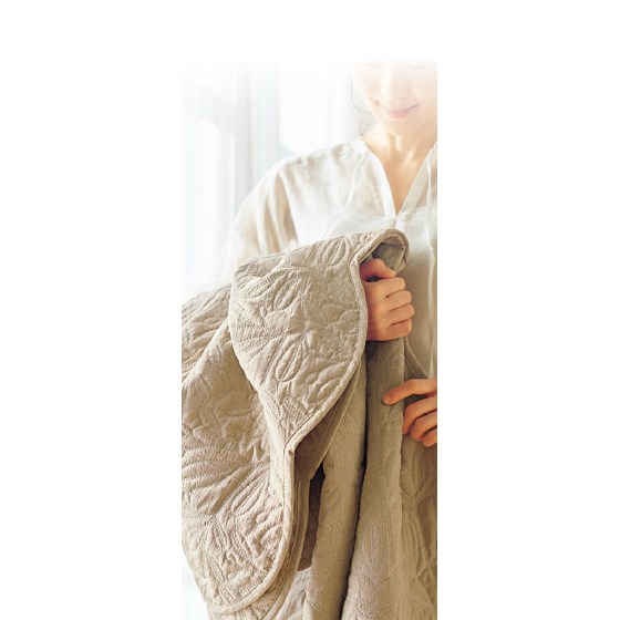 水洗いした先染め綿で、やわらかくサラリとした肌触り。繊細なコンピューターキルトでボタニカル柄を描き出しています。