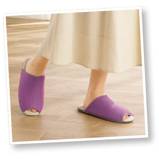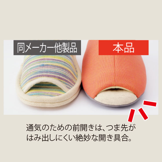 創業100年を超える履き物メーカーが手がけたこだわりの一足。見た目の美しさもさることながら、履き心地のよさに作り手の思いやりが詰まっています。甲や足裏に当たる部分は綿麻素材を使用し、ムレにくくさわやか。クッション性も高くしっかりと体を支えるので、家事で動き回っても疲れにくいのが特長です。信念のある素材選び、丁寧な縫製はもちろん、スリッパづくり一筋の実力が光っています。