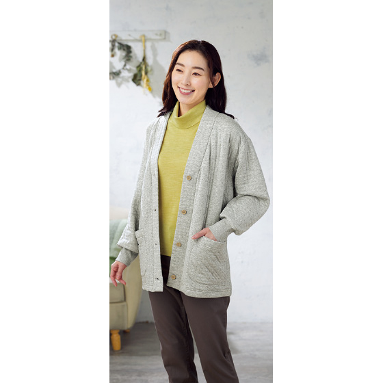 表も裏も綿100%で、ちくちくしにくい。中わたをサンドしているので、空気を多く含んであったかい。ソフトで軽く、リラックスタイムにぴったり。