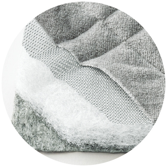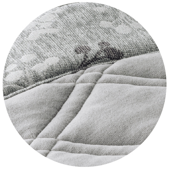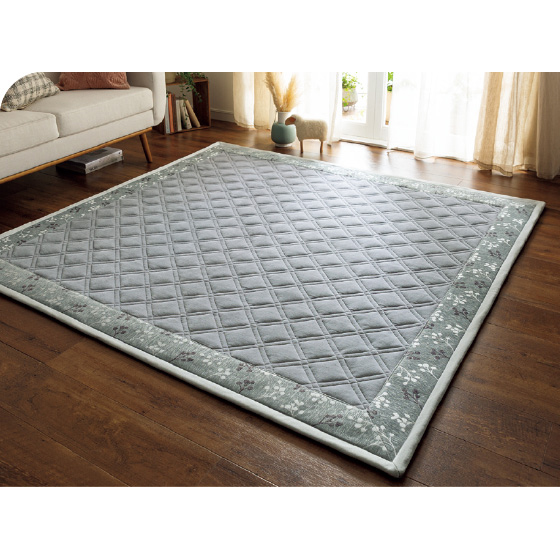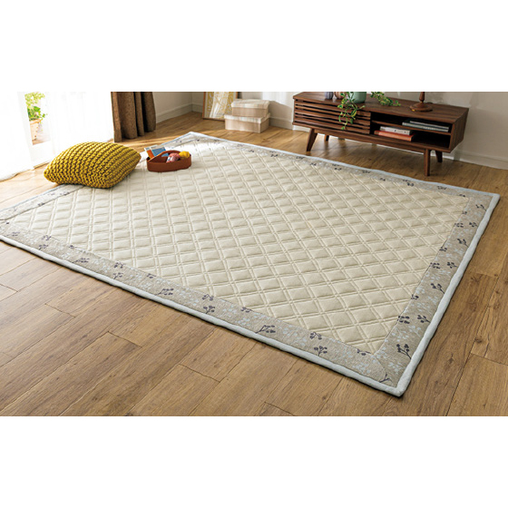 ●素材:表地(無地)=毛羽部/綿100%、グランド糸/ポリエステル100%、表地(柄部)=ポリエステル100%、中材=ポリエステル100%(アルミシート入り)、裏面=不織布張り(すべりにくい加工)