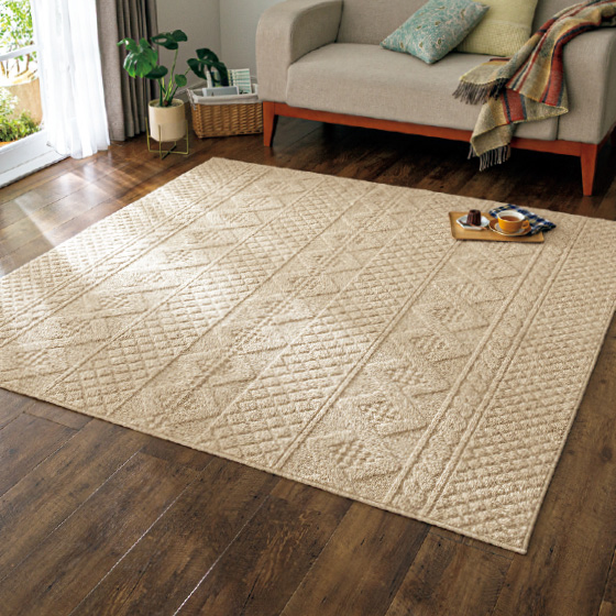 丸洗いできて、いつでも清潔。ぬくもりあるニット編み風デザインのウール混ラグ。