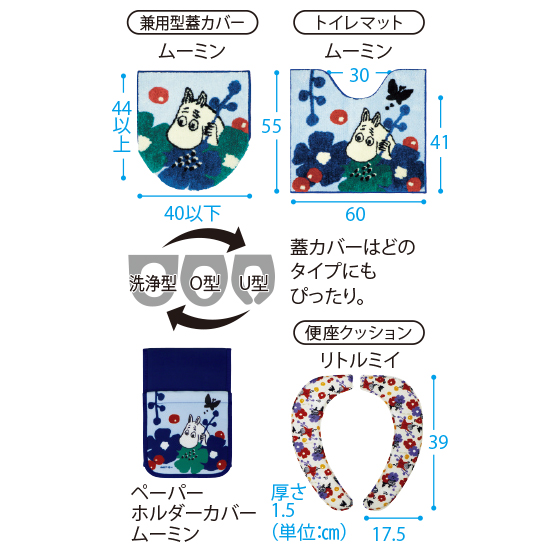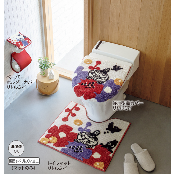 ●素材:トイレマット/パイル糸=ポリエステル100%、裏面=不織布張り(すべりにくい加工)、兼用型蓋カバー/パイル糸=ポリエステル100%、ペーパーホルダーカバー/表生地=ポリエステル92%・ポリウレタン8%、便座クッション/表面=ポリエステル100%、中芯=ポリウレタンフォーム、裏面=熱可塑性エラストマー
