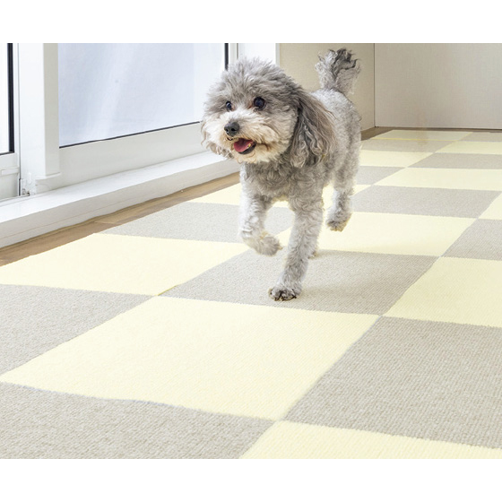 裏面に独自の吸着加工を施しているから、ペットが走り回ってもズレにくい!しかも汚れたところだけ剥がして丸洗いできるタイルタイプ。薄手だから掃除機がけもラクラクと、ペットも飼い主さんも満足のマットです。