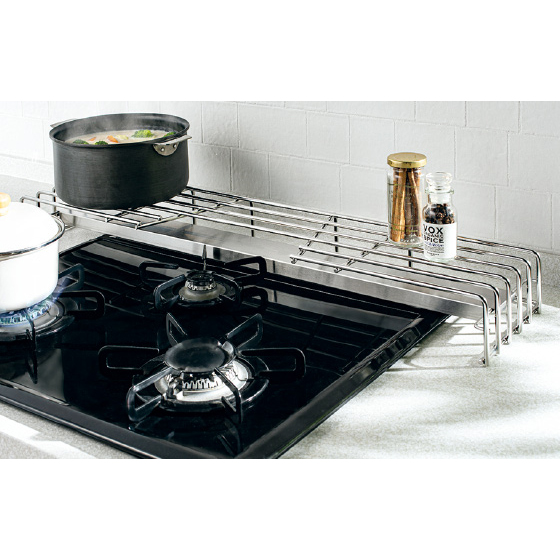 調理中の重い鍋が置ける頑丈ラック。汚れやすい排気口も同時にカバー。