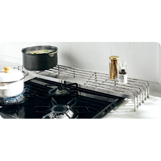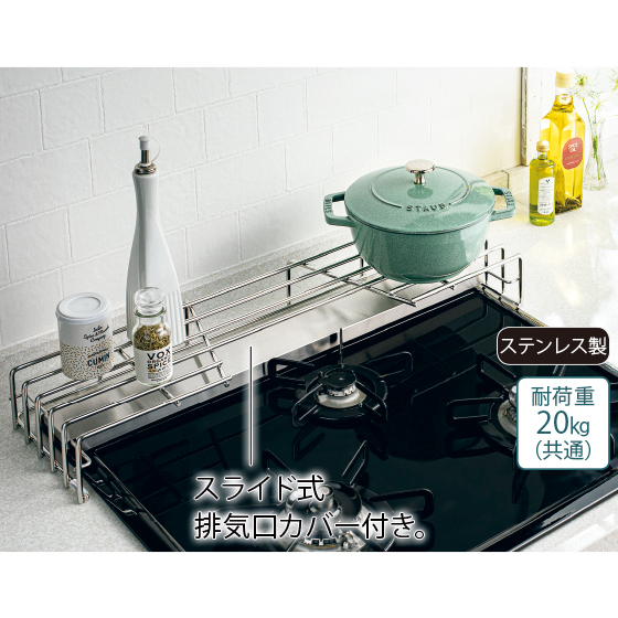 調理中の重い鍋が置ける頑丈ラック。汚れやすい排気口も同時にカバー。