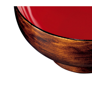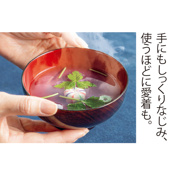 外側は木目が映える摺り漆仕上げ。口縁にも黒漆を施し、内外の対比を美しく際立たせています。