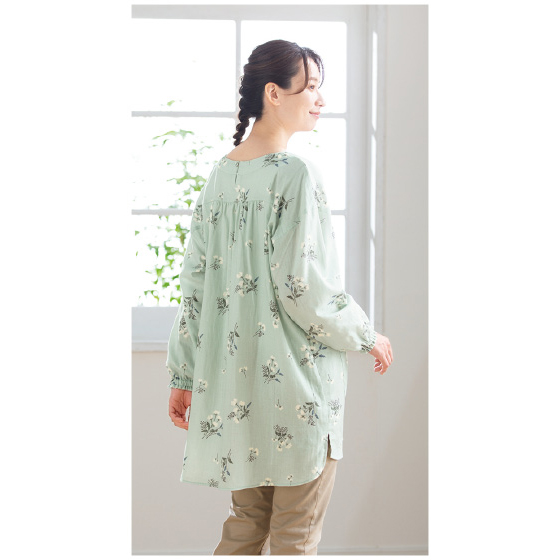 汗を吸いやわらかな肌触りの2重ガーゼ。お尻がほどよく隠れる長さ。長袖の袖口は腕まくりしやすいゴム仕様。左右にポケット付き。