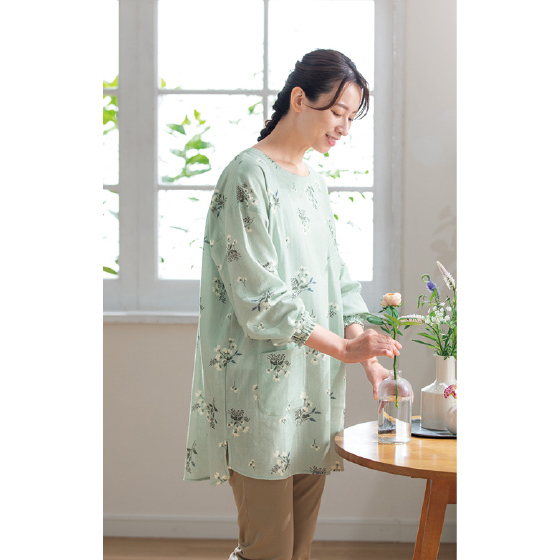 ふんわり軽い、綿100%の2重ガーゼ。着心地のよいエプロンで家事を楽しく。