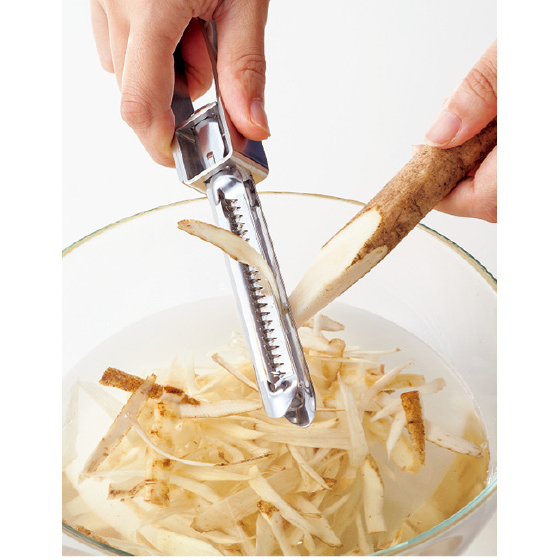 調理に欠かせないスライサー。でも、よくあるプレートタイプは付属品が多くて面倒だったりしませんか?本品は一見普通の大きめピーラーですが、実は表と裏で異なる2種の刃があります。しかも切れ味は包丁並み。通常の皮むきやスライスはもちろん、ギザ刃を使えば細切りだってサクッとでき上がり。お鍋やボウルの上で手軽にカットできるから、包丁・まな板要らずで後片づけもラク。上手に使えば時短調理に!