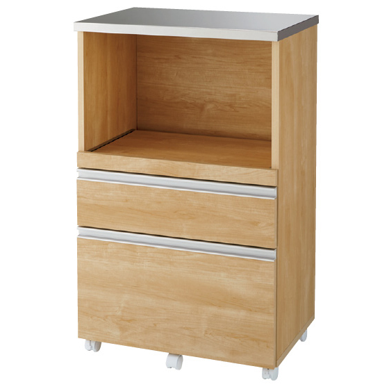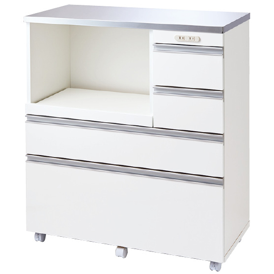 家電や食器、調理器具などがまとめてしまえるスグレもの。スライド棚を引き出して、その場で調理用家電が使えます。天板上に電子レンジを置けば使いやすい高さになります。
