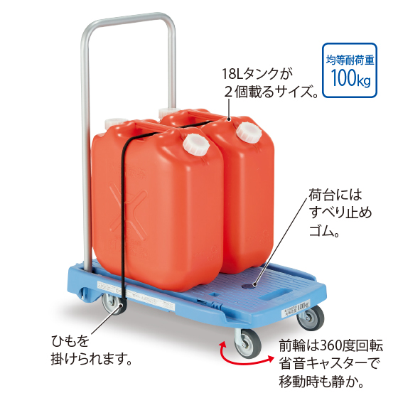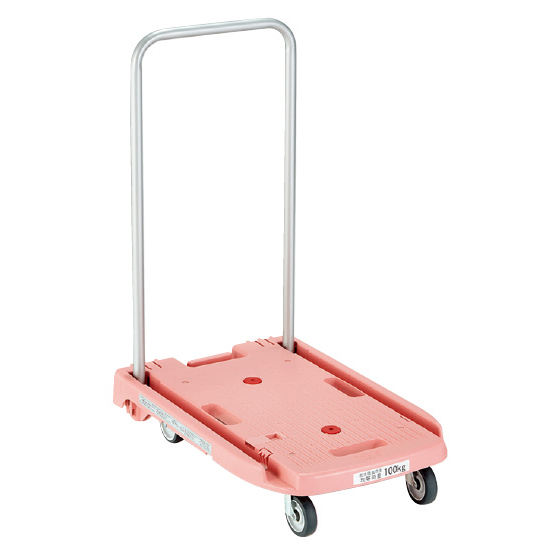 取り扱いやすい軽量タイプながら、均等耐荷重100sの頑丈キャリー。ハンドルをたためば平台車にも。