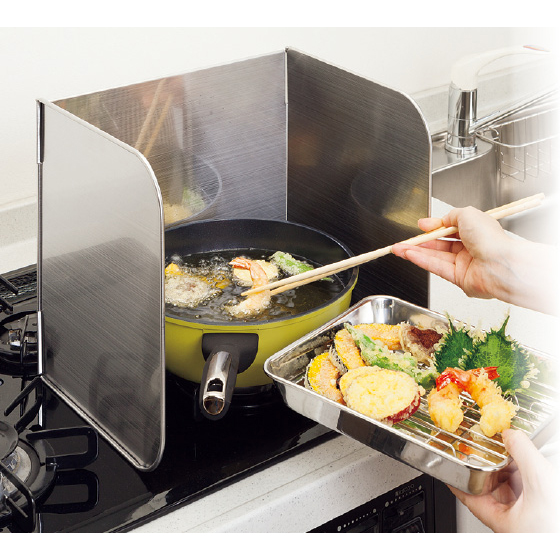 揚げ物や炒め物のときに、パッと取り出して一口だけを囲えるコンパクトなコンロガード。ステンレス製だからサビにくくお手入れもラク。洗って繰り返し使えます。