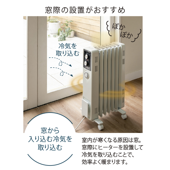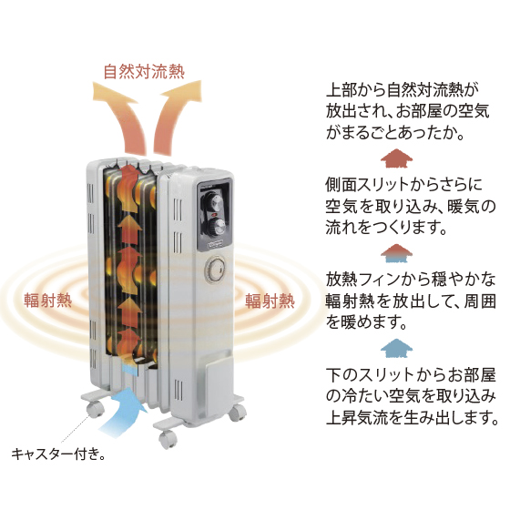 輻射熱により陽だまりのような暖かさをつくり出し、さらに上部からの自然対流熱でお部屋をムラなく暖めます。