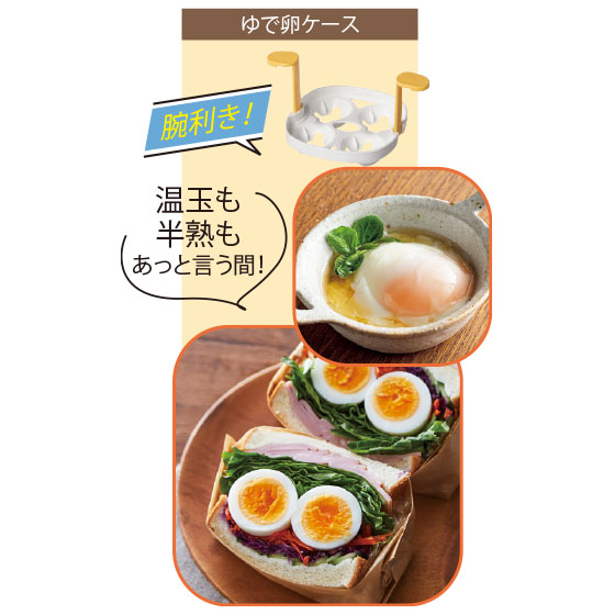 ●材質:本体=ポリプロピレン・ステンレス鋼・シリコン、ゆで卵ケース・オムレツケース・蒸し料理ケース=ポリプロピレン
