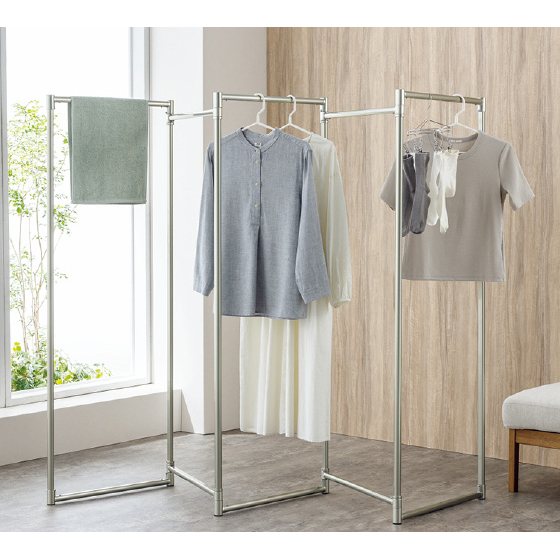 干す量やスペースに合わせて屏風型や、コの字型に置け、軽量だから移動もラクラク。