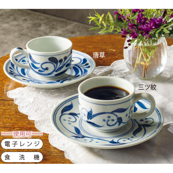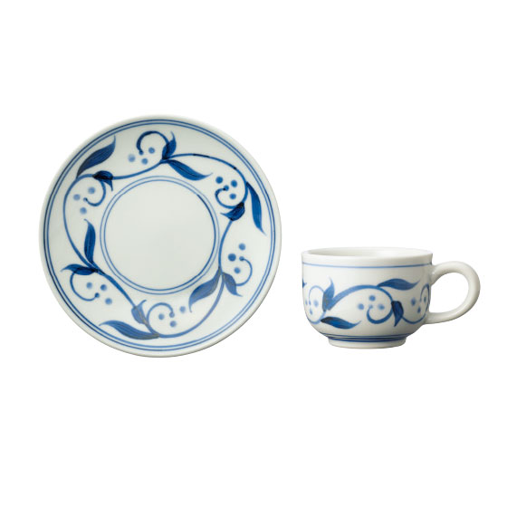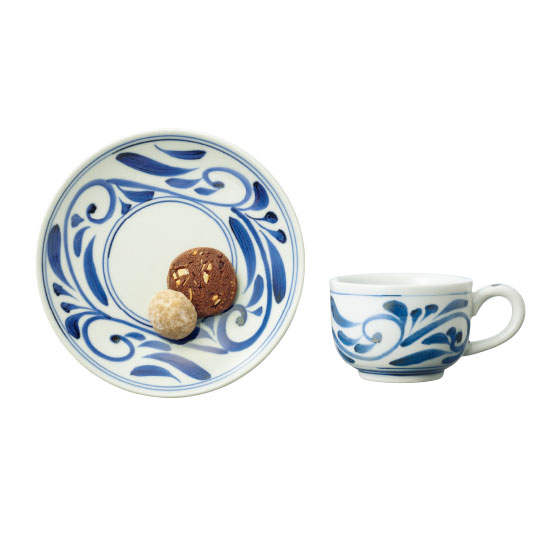砥部焼の代表的な文様をモダンにデザイン。ソーサーはお菓子受けとしても。
