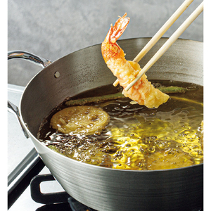 蓄熱性が高く、油を高温に保つ厚い鉄板を使用。広口形状で食材の余分な水分を飛ばし、ベタつきを防ぎカラッと揚がります。