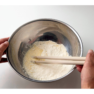衣はプロ仕様の粉箸でさっくり混ぜます。