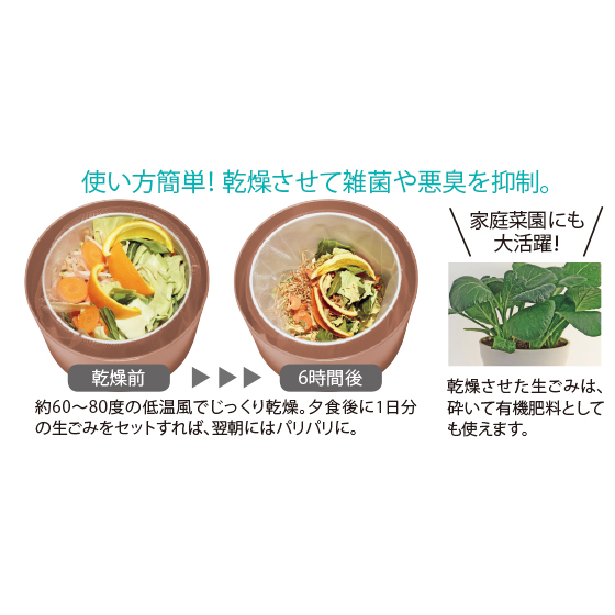 約60〜80度の低温風でじっくり乾燥。夕食後に1日分の生ごみをセットすれば、翌朝にはパリパリに。乾燥させた生ごみは、砕いて有機肥料としても使えます。