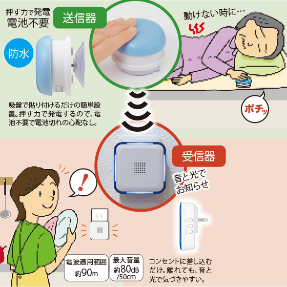 助けを借りたいときにボタンを押すと、音と光で家族にお知らせ。設置が簡単で電池交換も不要です。送信器は防水仕様で水回りでも使えます。