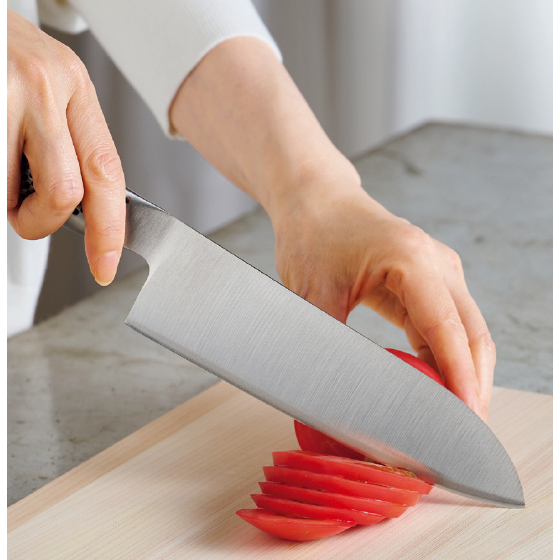 緩やかなカーブを描くハマグリ刃は、食材の刃離れがよく、切りやすさを追求した構造。刃こぼれしにくい刃先の強度となめらかな切れ味を兼ね備えつつ、道具としての美を極めたフォルムも魅力です。