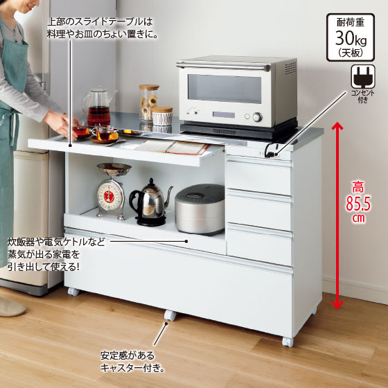 お手入れや水や熱に強く、熱いお鍋をちょい置きできます。また、家電も設置可能。