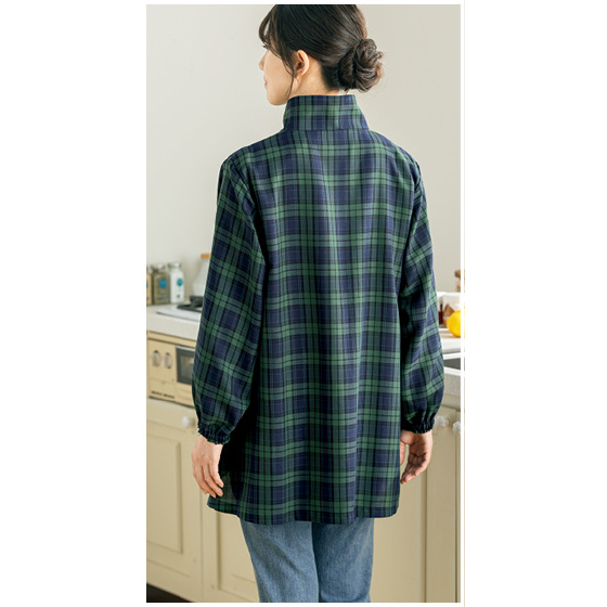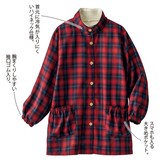 立ち襟で首元も暖かくて台所仕事にとても助かっています。お値段も手ごろでとても助かります。ただ私には少し大きすぎました。Mサイズがあればと思います。また手首が少し大きくゆるいので袖をまくり上げて水仕事するときに不自由です。ゴムの差し替えができる入り口があればと思います。色についてですが以前のようにベージュ色のものもあればと思います。グリーンは暗い感じがします。また赤色は年齢的にどうかとためらうことです。ボタンもファスナーだったら脱ぎ着が早くでき助かるかと。色々と申し訳ありません。