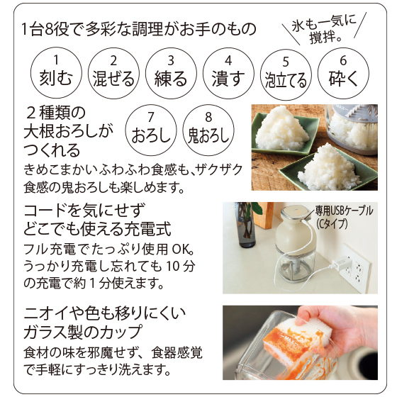みじん切りから鬼おろしまで、面倒な作業はおまかせ。材料を入れてボタンを押すだけの簡単2ステップ。いろいろな下ごしらえはもちろん、ジェラートやスムージーなどのデザートづくりも大得意です。コードレスだから使う場所も選ばない!