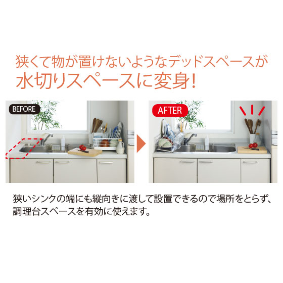 狭くて物が置けないようなデッドスペースが、水切りスペースに変身!狭いシンクの端にも縦向きに渡して設置できるので場所をとらず、調理台スペースを有効に使えます。