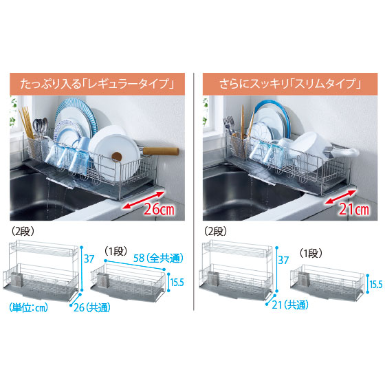 ●サイズ:幅21×奥58×高15.5(スリム)・37(スリム2段)cm、幅26×奥58×高15.5(レギュラー)・37(レギュラー2段)cm、箸ポケット=幅9×奥6.2×高10cm、グラスホルダー=幅22×奥4.5×高12cm