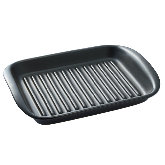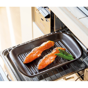 蓄熱性の高い陶磁器が食材にじんわり熱を加え、短時間で焼き上げます。溝に油が落ちてヘルシー。