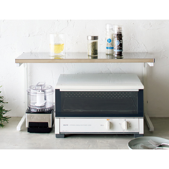 熱や水に強いステンレス天板。アジャスター付きでがたつきにくい。家電を収めて、上部を便利に使うことも。